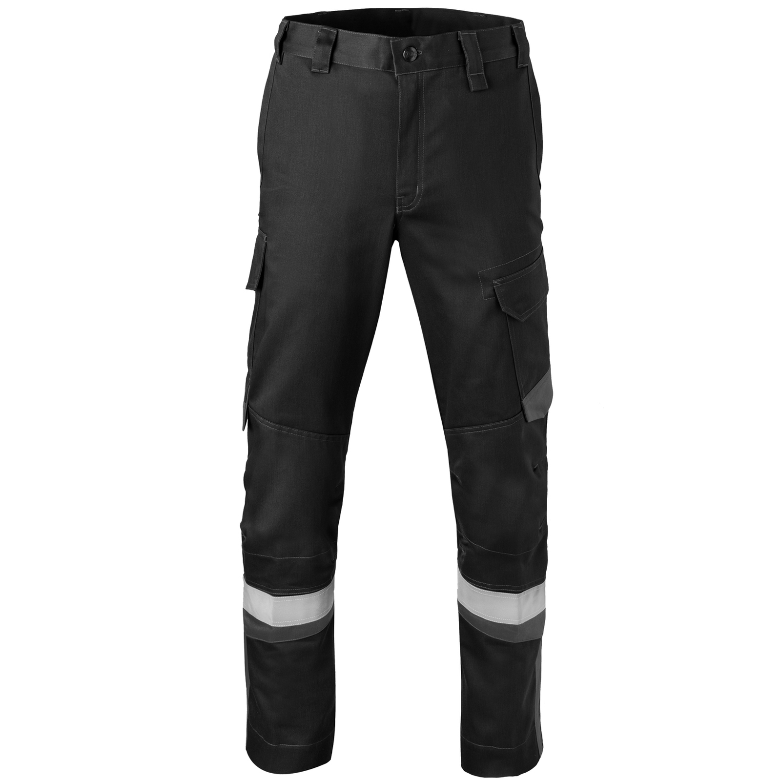 Verdeckter Reißverschluss, 2 Seitentaschen, 2 Gesäßtaschen mit Patte, Metermaßtasche mit Patte, Oberschenkeltasche mit Patte, Knietaschen, flammhemmende Reflektionsstreifen an den Unterschenkel.
