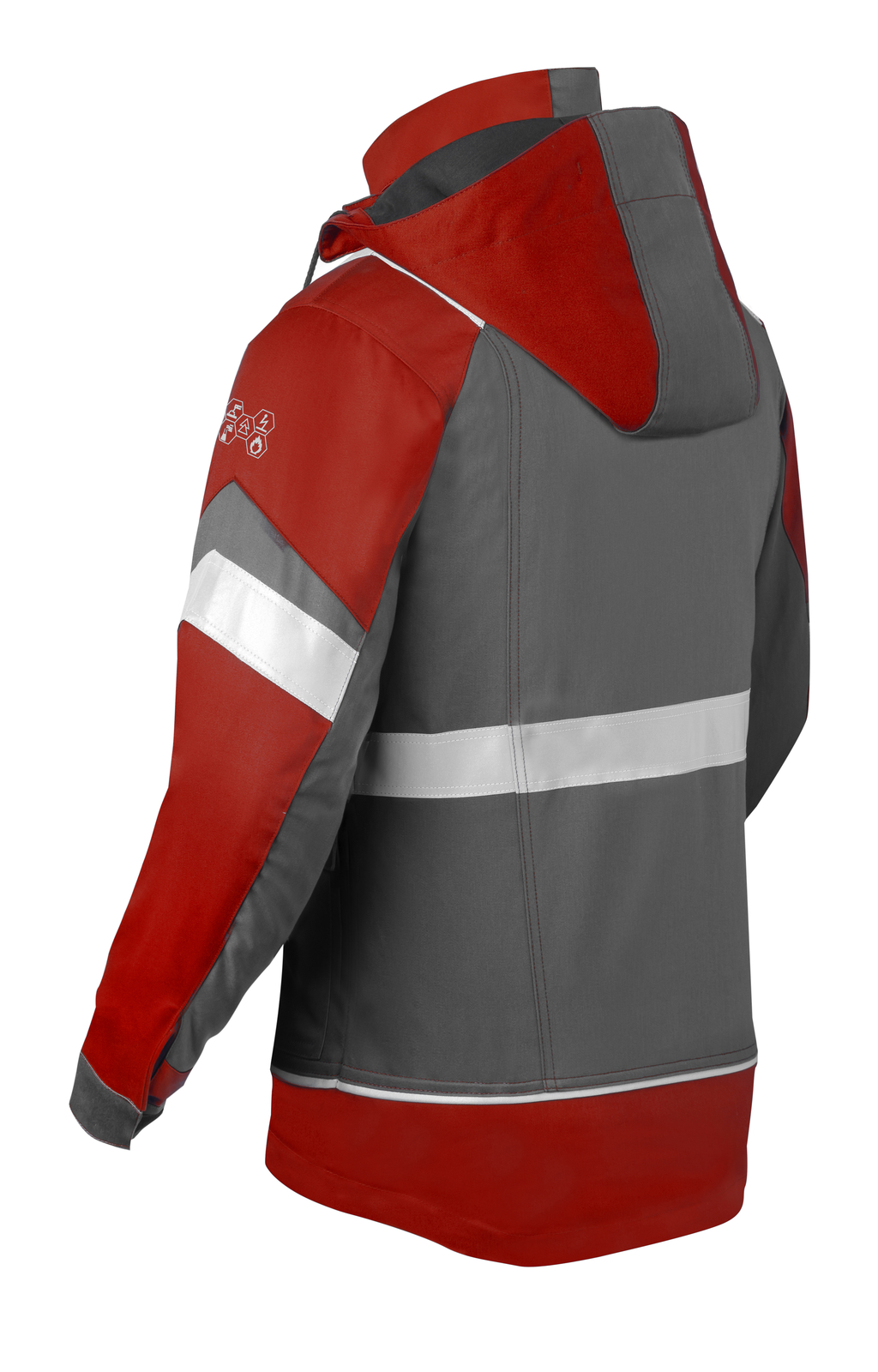 verdeckter Reißverschluss mit verdeckten Druckknöpfen, 2 Vortaschen mit Patte, 2 eingesetzte Brusttaschen, die rechte Brusttasche hat einen D-Ring für ein Namensschild, abnehmbare Kapuze mit Kordel, mit Reißverschluss zu befestigendes Innenfutter (separat erhältlich), Schlaufe für Atemschutzmaske, Manschetten mit Klettband, verlängerter Rücken, flammhemmende Reflektionsstreifen.